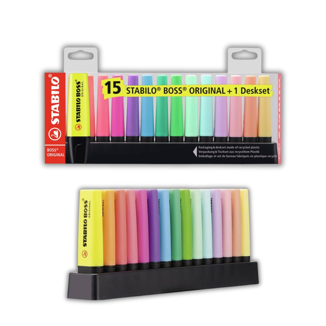 Set da 15 evidenziatori Stabilo Boss Original 9 colori fluo 6 colori pastello 1 deskset da scrivania