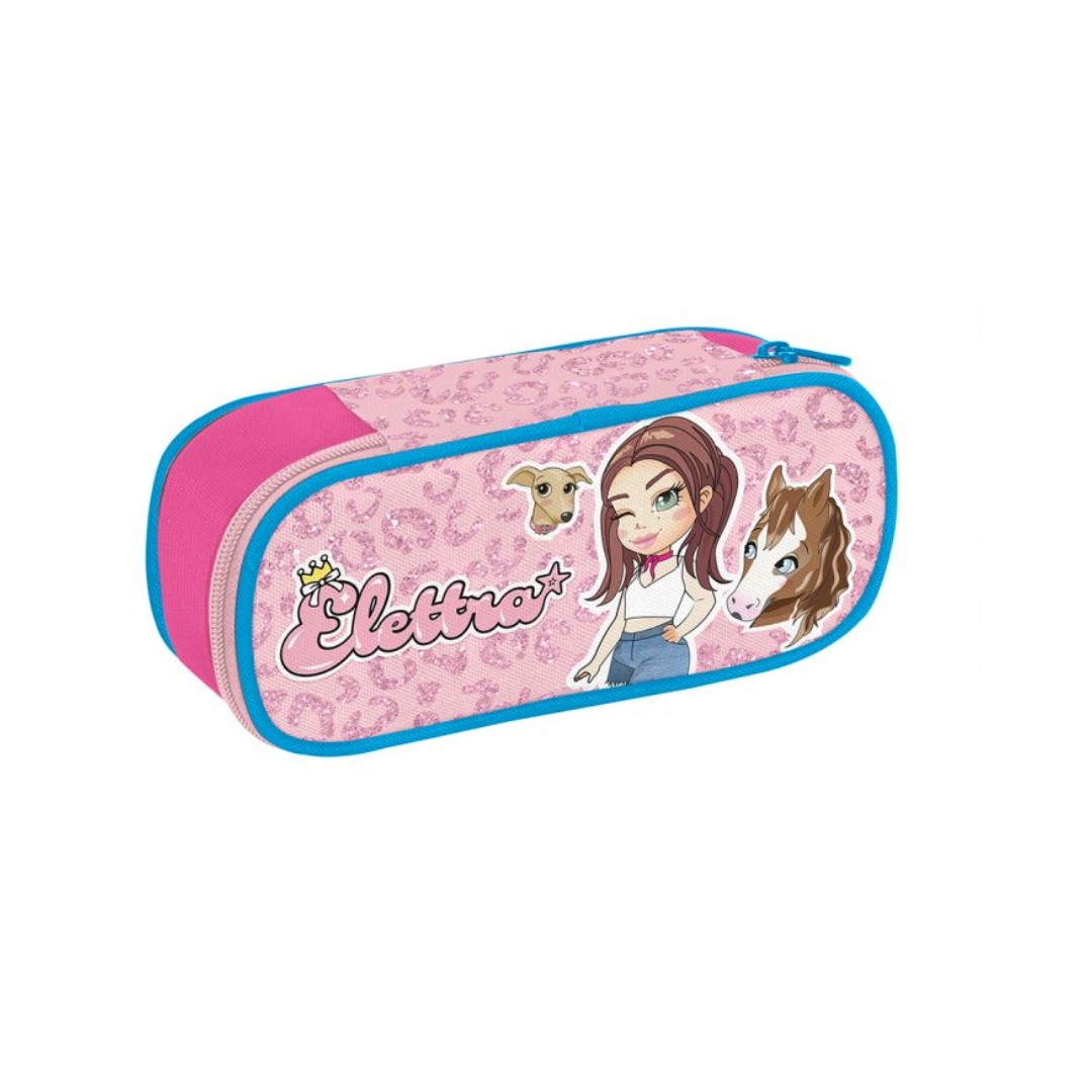 Apertura con zip in contrasto colore, taschino interno chiuso con zip, pianetto interno, portamatite con elastici, piping in contrasto colore, logo serigrafato puff, allover leopardato serigrafato con scintillante, personaggi serigrafati. Dimensioni: 23 x 10 x 5,5 cm