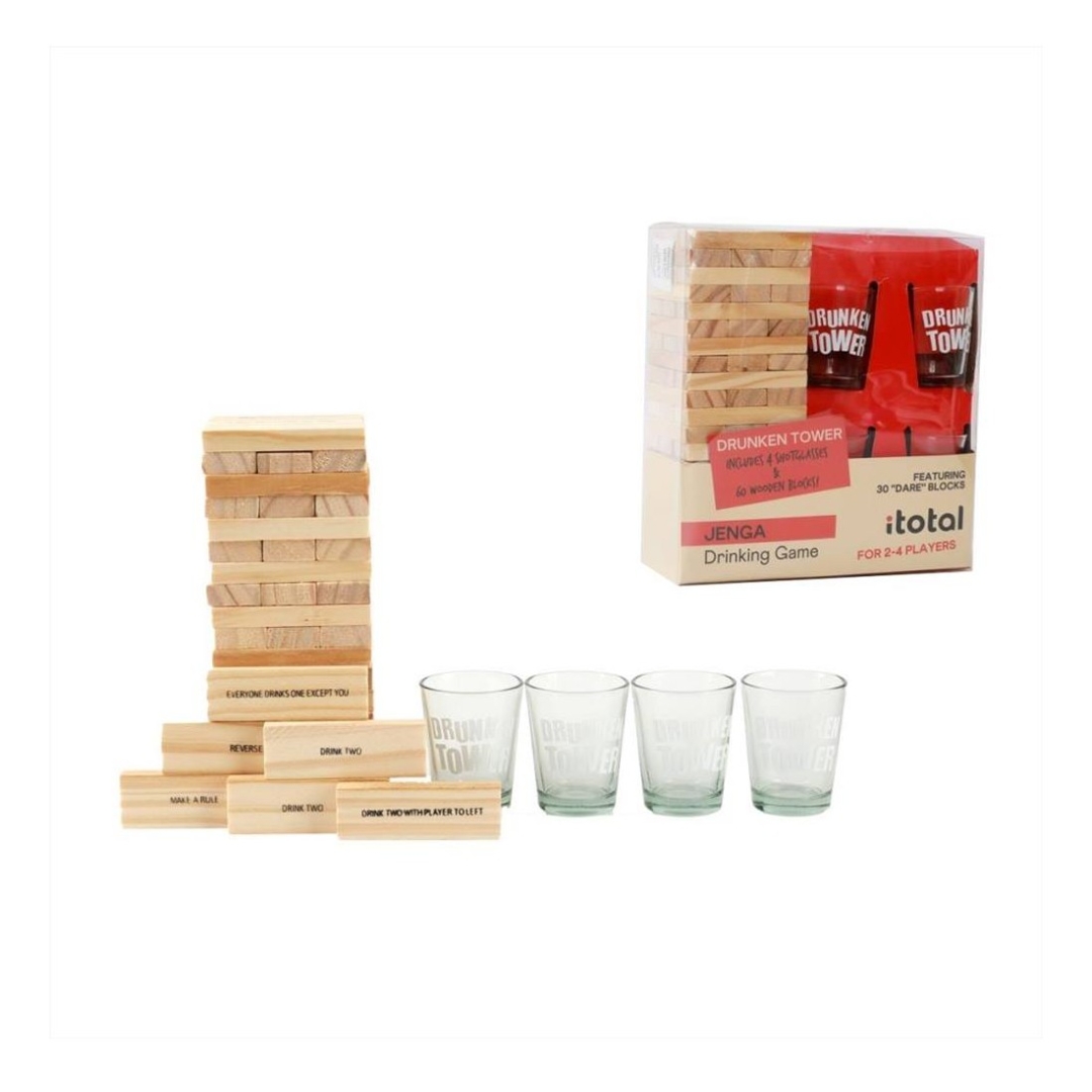 JENGA - 60 blocchi di legno con impegni scritti sotto alcuni blocchi - 4 bicchierini in vetro da 4cl