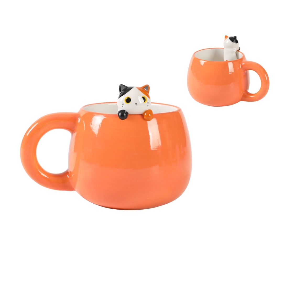 TAZZA IN CERAMICA ARANCIONE CON SIMPATICO GATTINO MACCHIETTA IN 3D